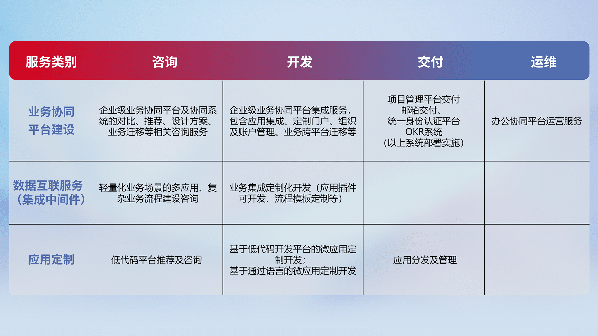 针对钉钉、、、、企微、、、、IDaas等平台级产品提供产品的规划、、、、方案、、交付、、、定制化开发等服务,,,实现如统一协同办公、、智能客户服务、、混合会议管理、、智能数据查询、、等业务场景,,,,实现数字化转型。。。
